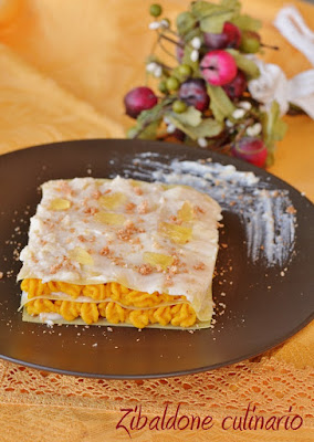 Fare più strati, a mio parere tre sono sufficienti e finire con besciamella al parmigiano con pezzetti di mostarda e amaretti.