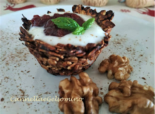 Ecco i cestini pronti per essere farciti. Ho utilizzato gli ingredienti di sempre: yogurt magro, mirtilli rossi in composta, una fogliolina di menta e in abbinamento le mie solite 3 noci. Che ve ne pare?