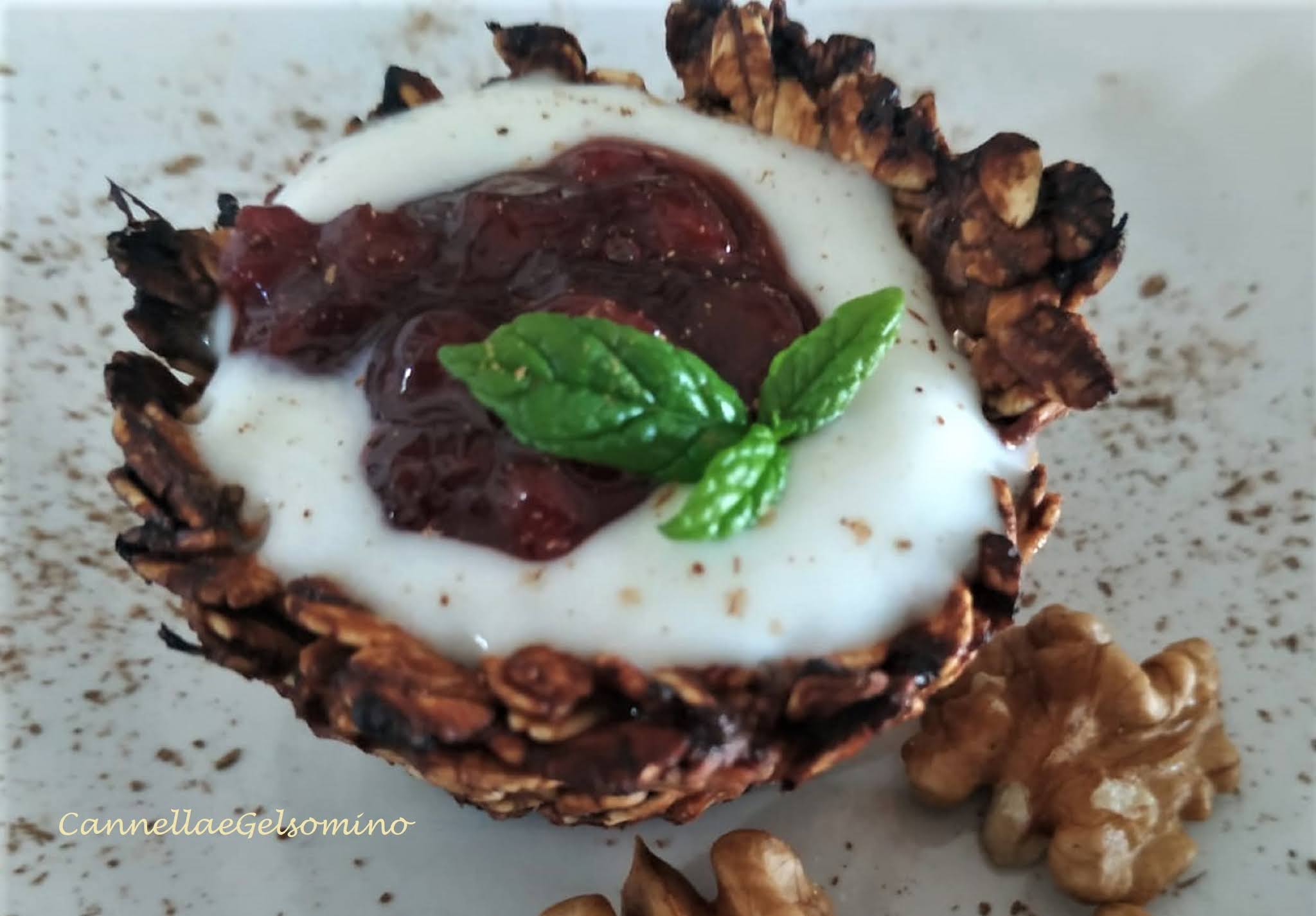 Ecco i cestini pronti per essere farciti. Ho utilizzato gli ingredienti di sempre: yogurt magro, mirtilli rossi in composta, una fogliolina di menta e in abbinamento le mie solite 3 noci. Che ve ne pare?