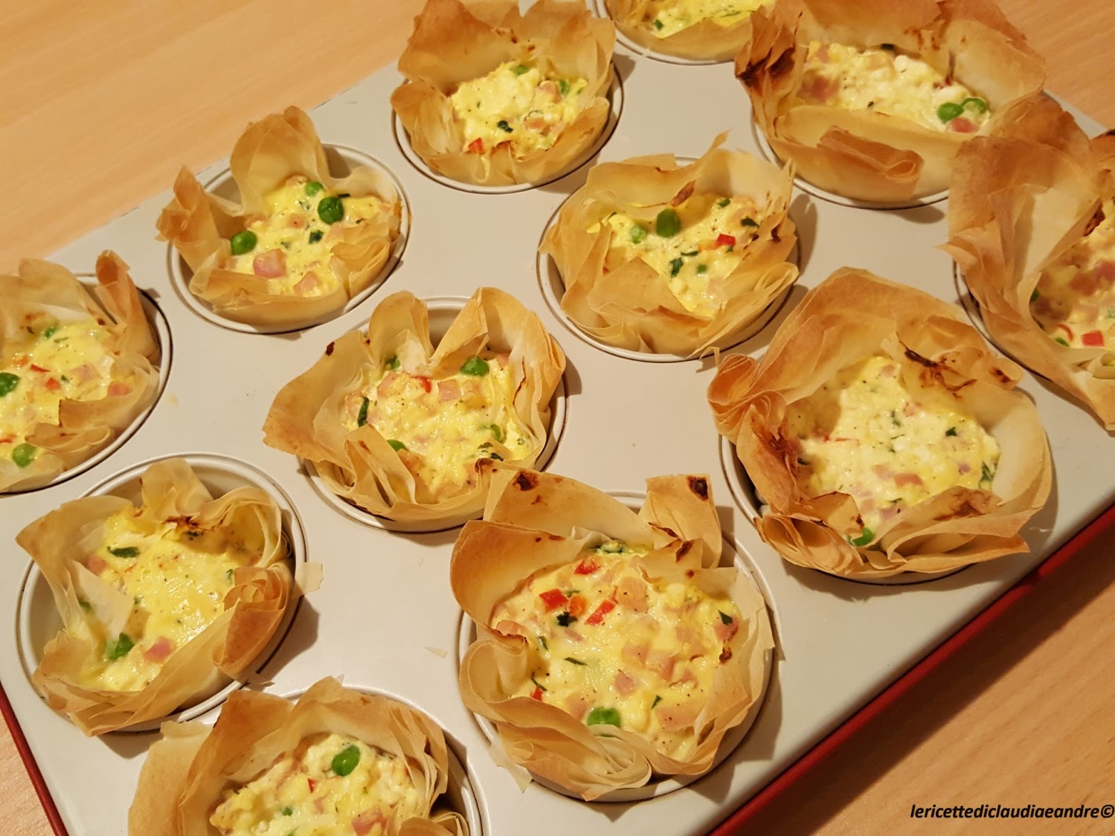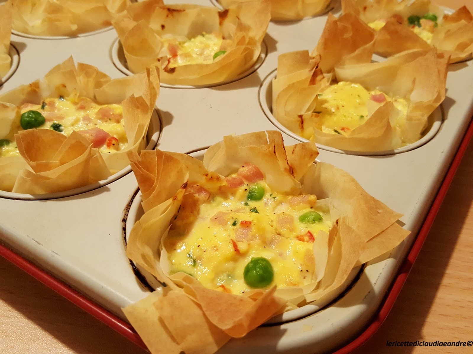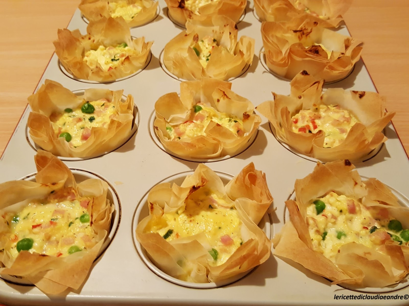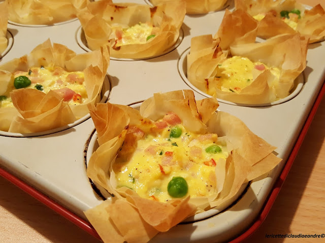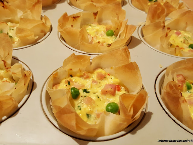 Cestini di pasta fillo con ricotta, prosciutto e pisellini
