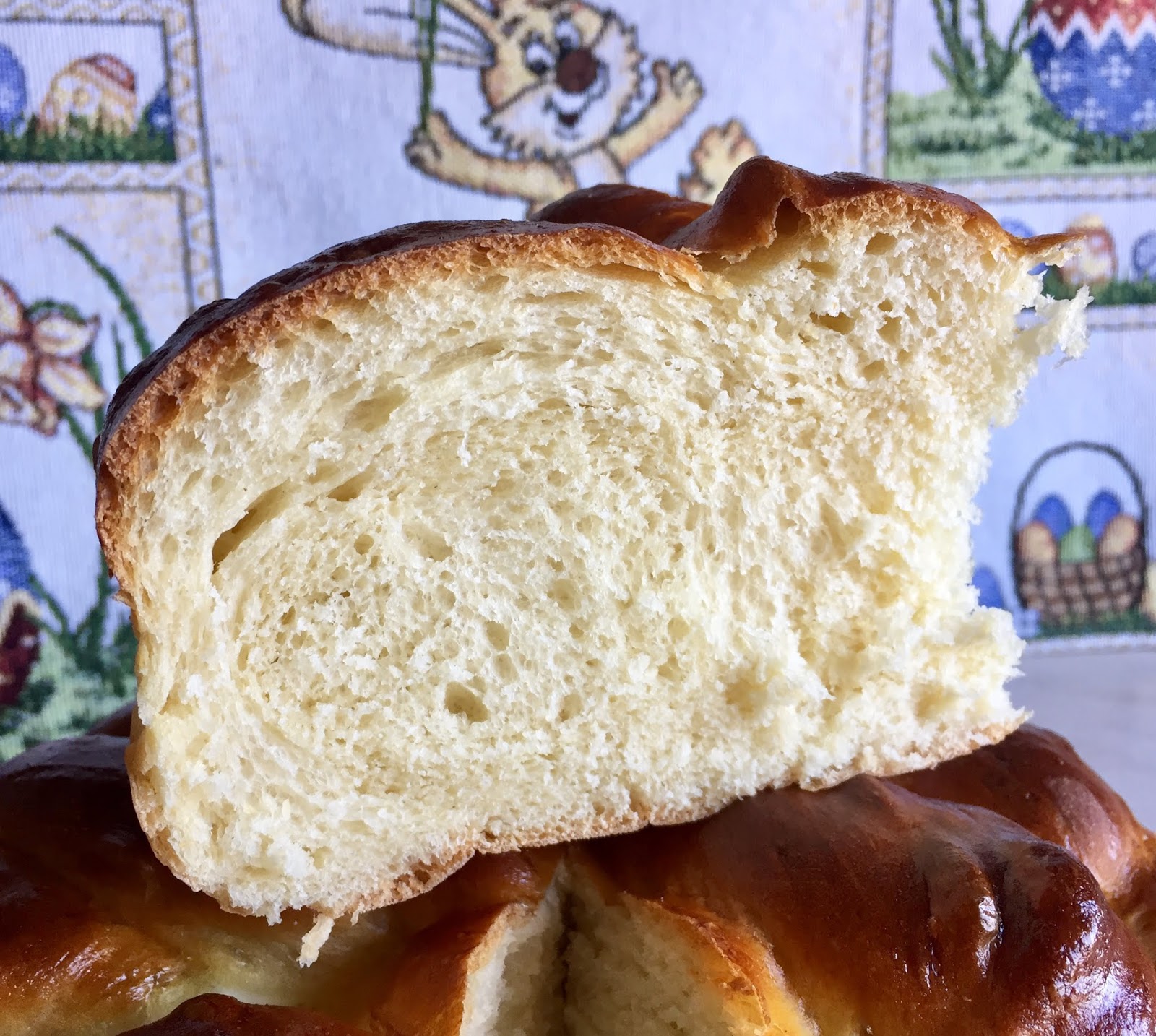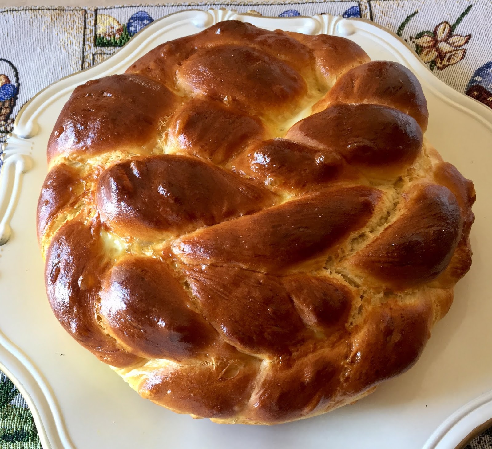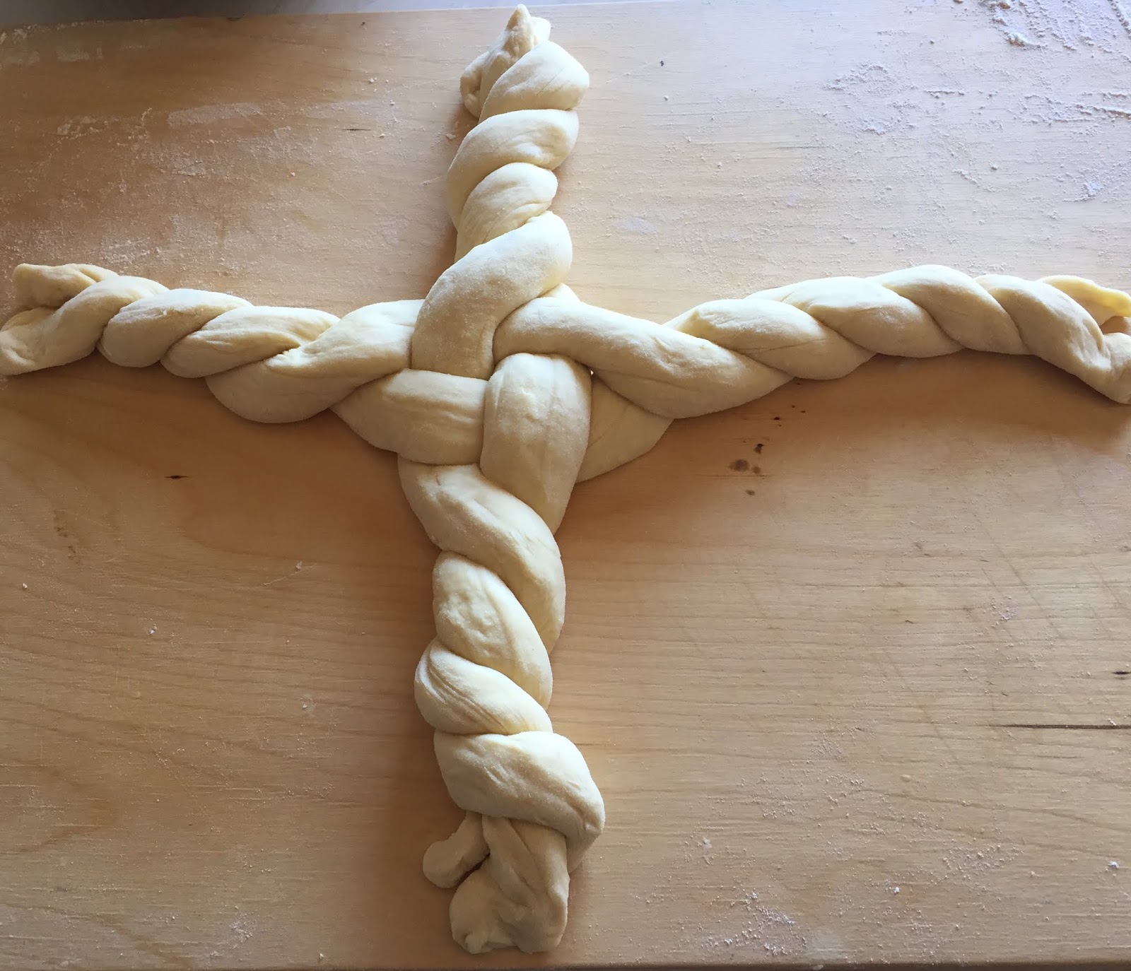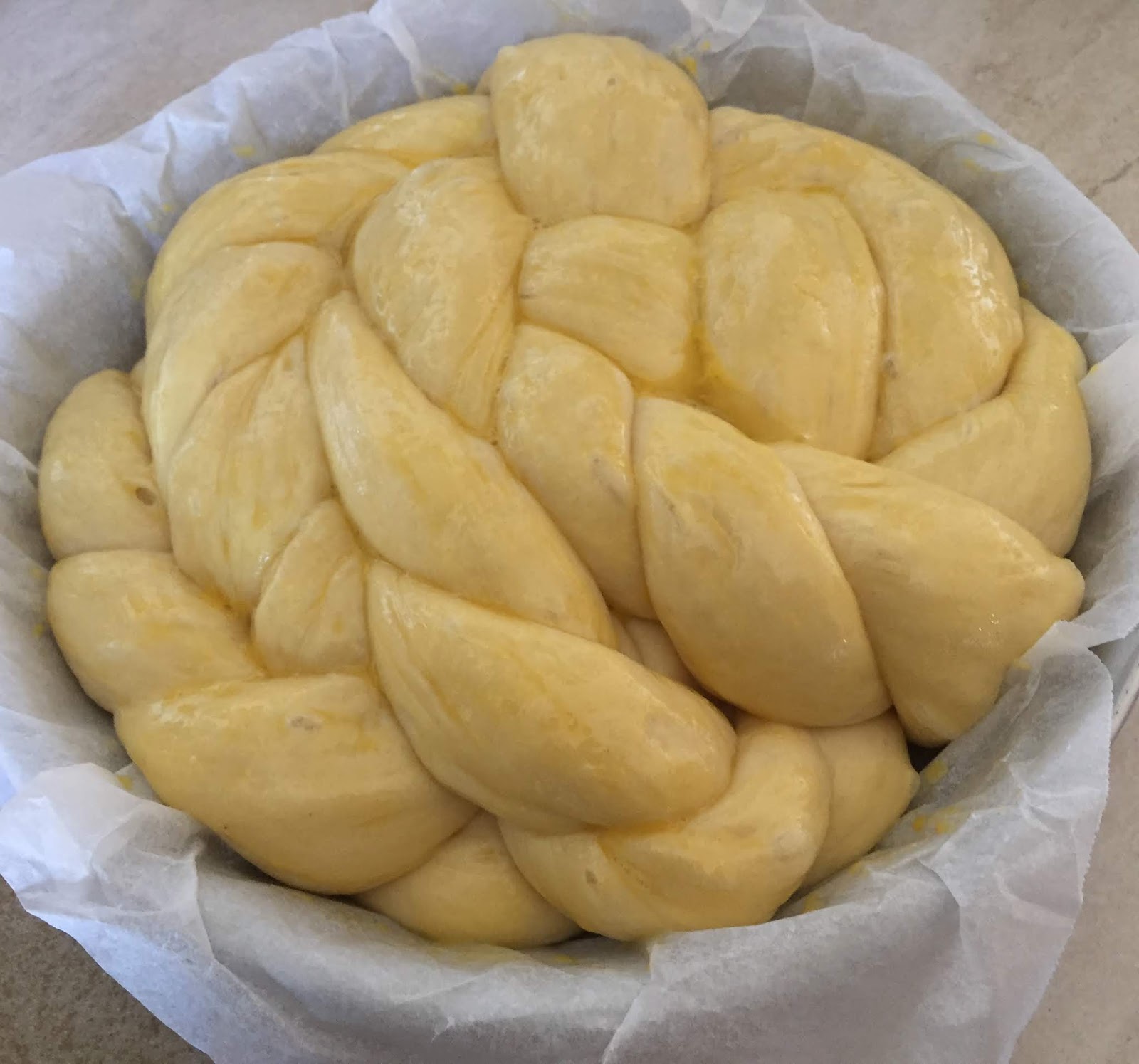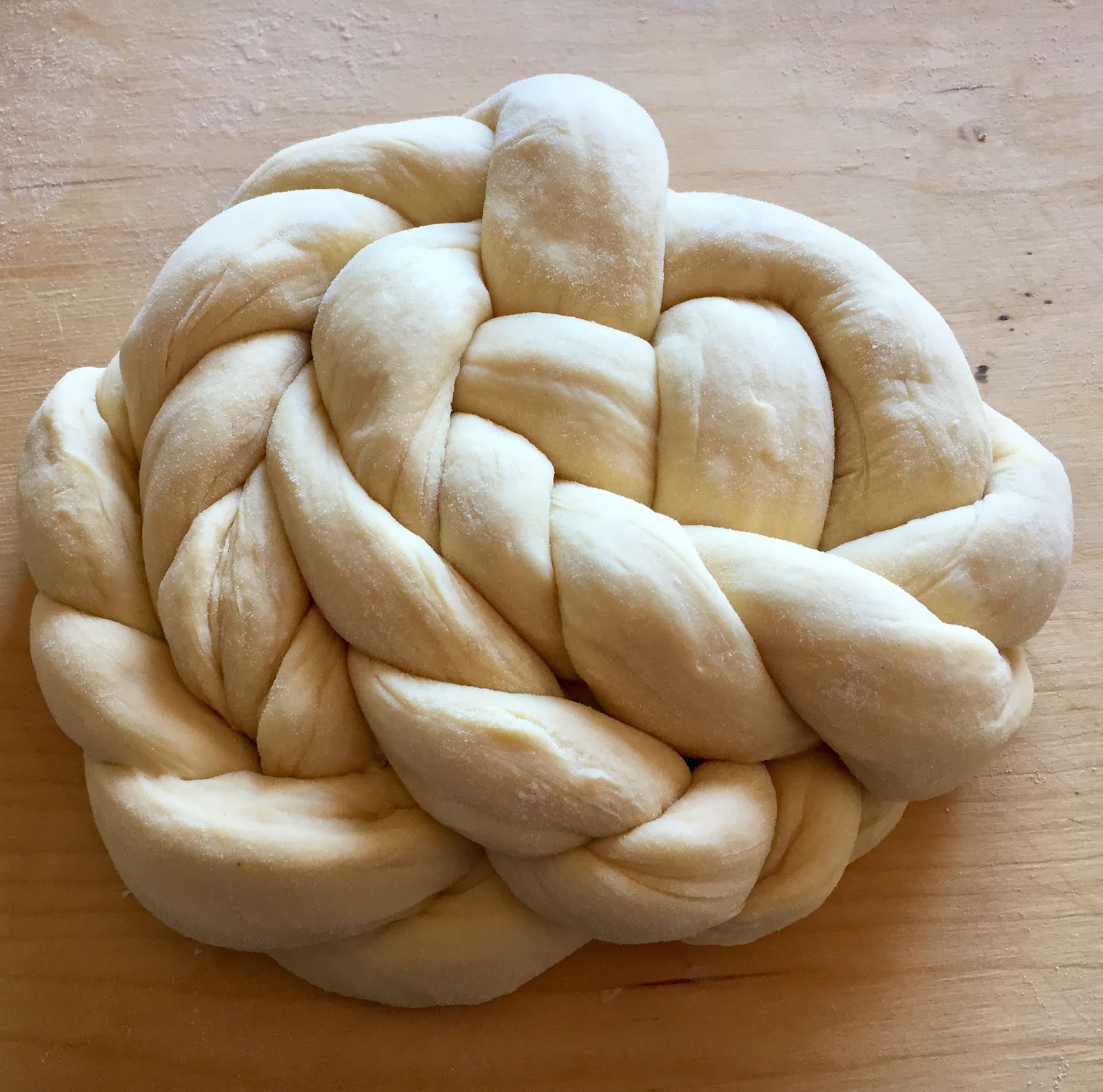 Mettete nella planetaria o su una spianatoia la farina e versatevi il lievito sciolto in una parte dell’acqua. Iniziate ad impastare e aggiungete il sale, le uova, l’olio, lo zucchero e il resto dell’acqua a filo. Finite di impastare sulla spianatoia infarinata e una volta ottenuto un panetto compatto ed elastico ungetelo con olio e mettetelo a lievitare in una ciotola anch’essa leggermente unta. Coprite con un panno umido (io con il coperchio della ciotola) e fate lievitare per almeno tre ore. Trascorso il tempo della lievitazione, rovesciate l’impasto sulla spianatoia, sgonfiatelo e dividetelo in quattro pezzi uguali. Formate dei filoncini e intrecciateli secondo la forma desiderata. Io ho scelto la forma rotonda, senza inizio e fine, simbolo di continuità.