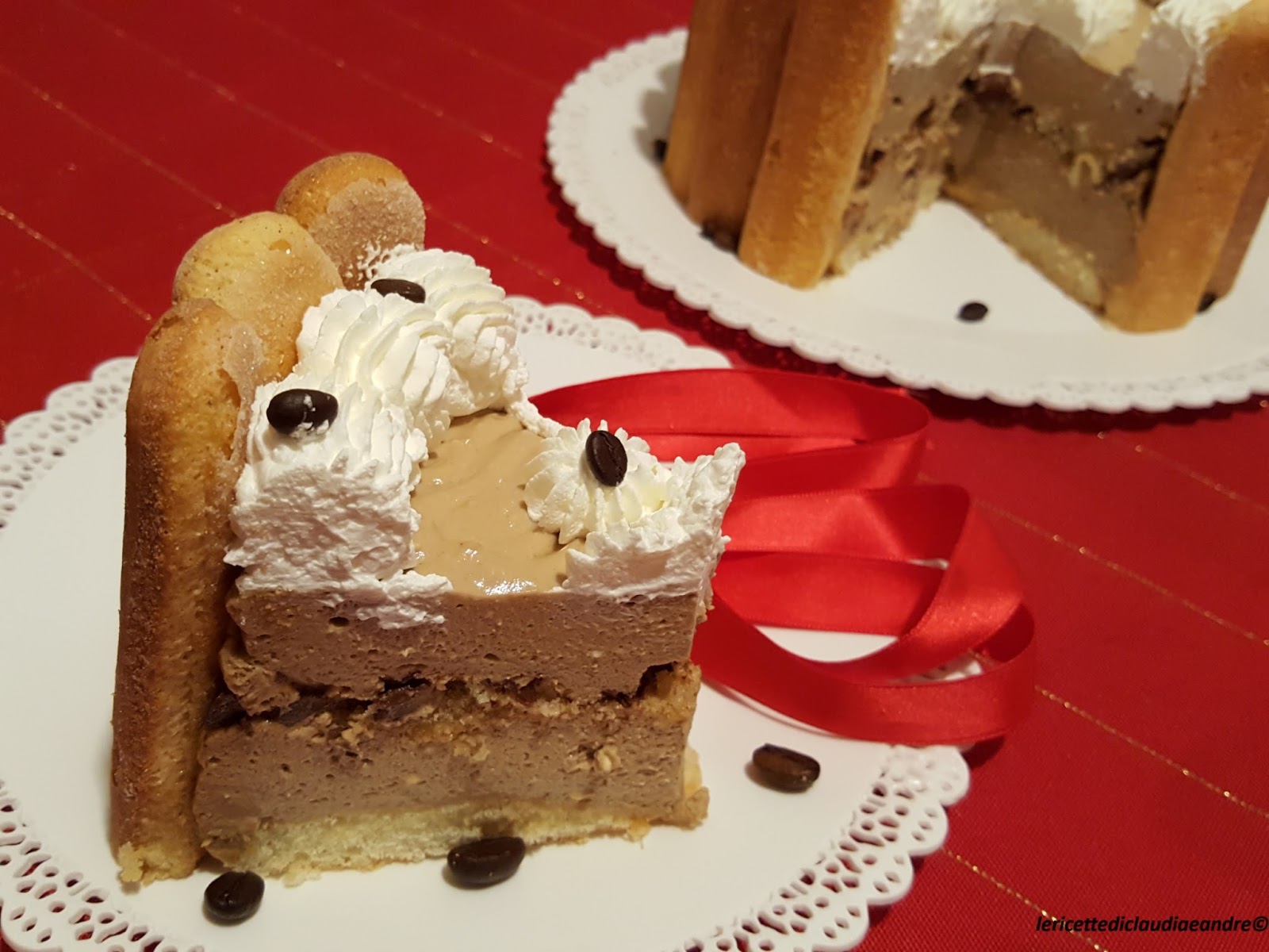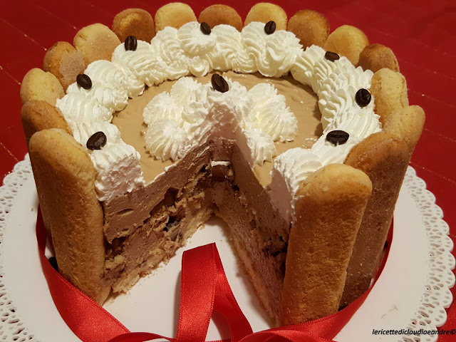 - Rovesciare dentro la corona di savoiardi metà della crema al caffè, sbriciolare dentro in modo grossolano circa 3 – 4 savoiardi e distribuire anche il cioccolato.