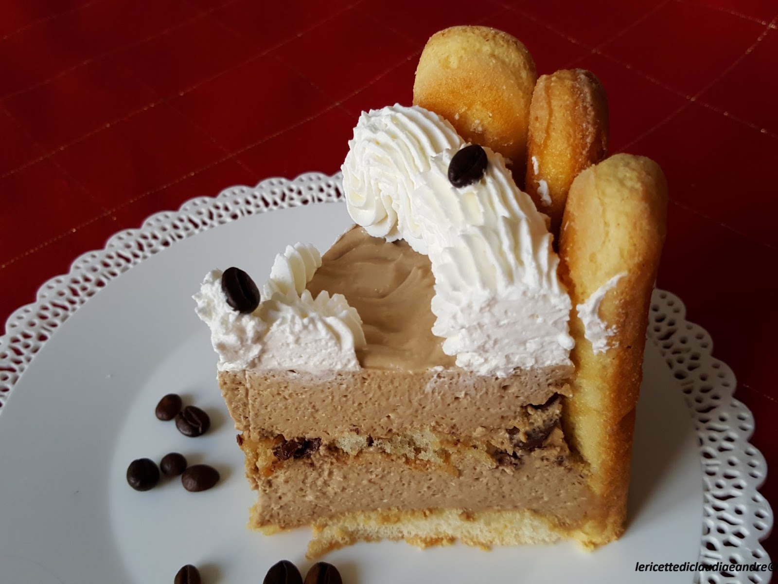 - Rovesciare dentro la corona di savoiardi metà della crema al caffè, sbriciolare dentro in modo grossolano circa 3 – 4 savoiardi e distribuire anche il cioccolato.