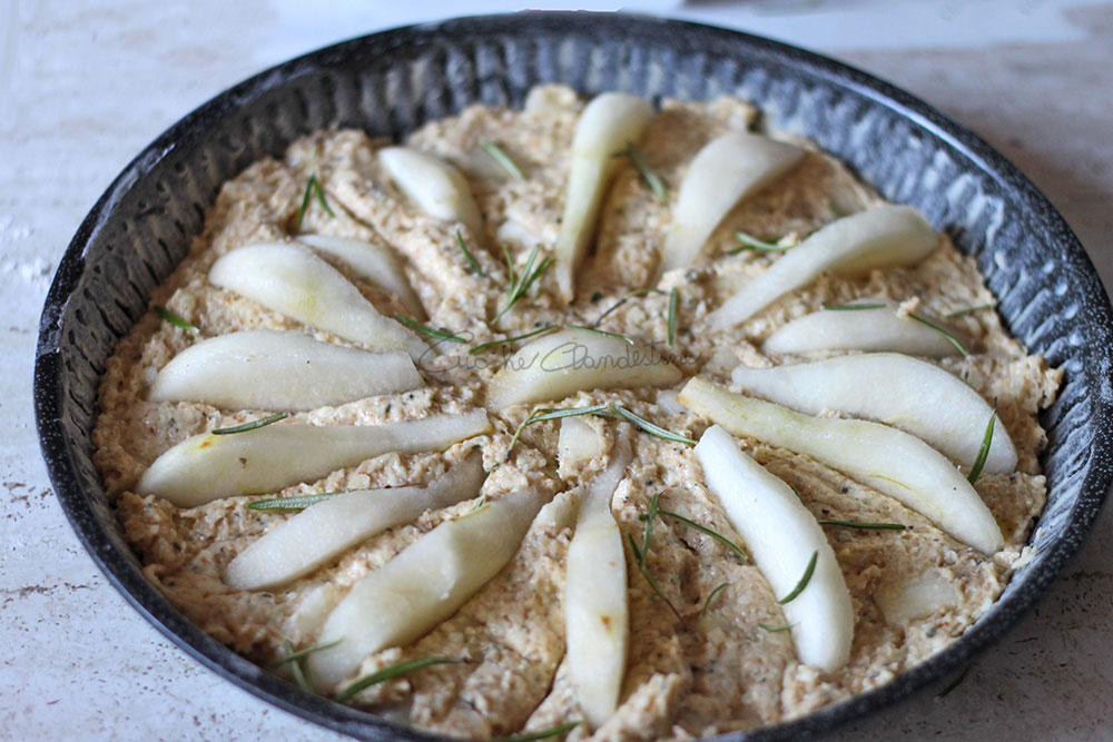 Pour the batter into the tart tin. Place the pear slices onto the top of the tart.