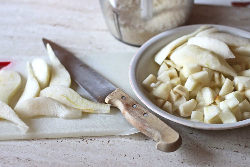 Finally, add cubed pears and combine.