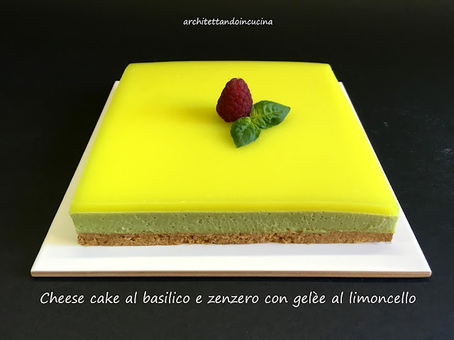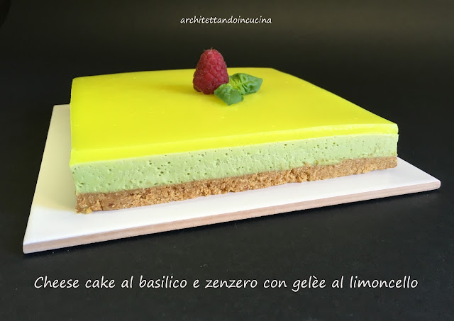 Ho rimuginato moltissimo, vedevo muoversi gli ingranaggi del mio cervello, ma tutto mi sembrava banale, visto e scontato. Poi la solita ricerca su Internet ed una sbirciatina a ciò che avevano già fatto le altre, mi gettato nello sconforto per giorni. A questo punto, siamo già a venerdì 20 maggio. Faccio una spesa a caso, facendo finta di avere tempo ed idee per una cheese cake dolce, ed una salata. E come al solito manca poco alla fine della gara, ma mi viene un lampo di genio (anche meno, in realtà una sorta di idea!): cheese cake con biscotto alle mandorle, cioccolato bianco, basilico e zenzero con gelée al limoncello. Il mio obiettivo era riuscire a mantenere i colori (ho una vera fissa per questo!) il marrone chiaro dei biscotti, con il verde chiaro della cheese cake al basilico ed il giallo della gelée, ma nello stesso tempo il gusto doveva essere buono (i critici di casa mia sono implacabili!) e le consistenze belle al taglio (richiesto dal regolamento).