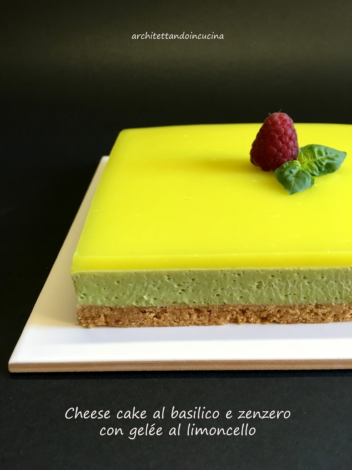 Ho rimuginato moltissimo, vedevo muoversi gli ingranaggi del mio cervello, ma tutto mi sembrava banale, visto e scontato. Poi la solita ricerca su Internet ed una sbirciatina a ciò che avevano già fatto le altre, mi gettato nello sconforto per giorni. A questo punto, siamo già a venerdì 20 maggio. Faccio una spesa a caso, facendo finta di avere tempo ed idee per una cheese cake dolce, ed una salata. E come al solito manca poco alla fine della gara, ma mi viene un lampo di genio (anche meno, in realtà una sorta di idea!): cheese cake con biscotto alle mandorle, cioccolato bianco, basilico e zenzero con gelée al limoncello. Il mio obiettivo era riuscire a mantenere i colori (ho una vera fissa per questo!) il marrone chiaro dei biscotti, con il verde chiaro della cheese cake al basilico ed il giallo della gelée, ma nello stesso tempo il gusto doveva essere buono (i critici di casa mia sono implacabili!) e le consistenze belle al taglio (richiesto dal regolamento).