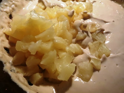 Aggiungere l’ananas ben scolato dal suo liquido, asciugato con carta da cucina e ridotto in dadolata ( serbare 2- 3 fette per la decorazione)…