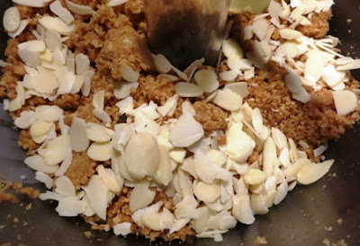 Non ricordo dove ho visto questa ricetta… ma la cosa che mi ha colpita nella preparazione della base di biscotto è stata l’aggiunta delle mandorle in lamelle..
