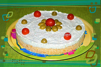Passato il tempo riprendere la Cheese cake dal frigorifero e decorarla mettendo al centro un pomodorino con attorno le metà delle olive verdi tagliate verticalmente per simulare i petali di un fiore.
