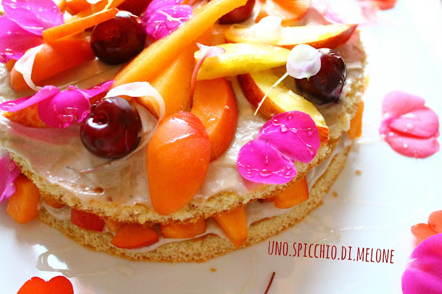 Inoltre, questo Pan di Spagna così colorato, pieno di frutta di stagione e di allegri petali commestibili…beh…non può che ricordare che la primavera!