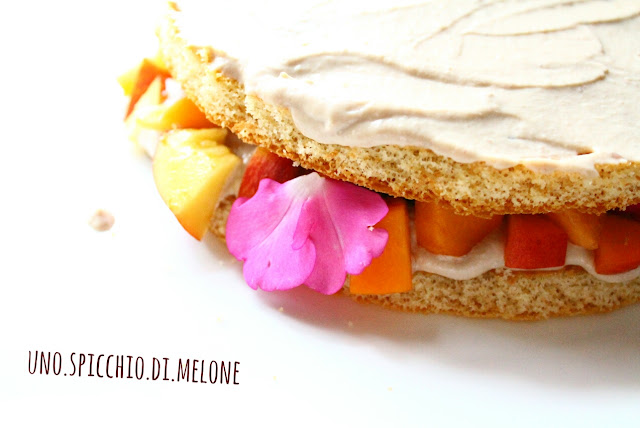 Su un piatto adagiate il primo disco di pan di spagna e iniziate a farcirlo con il composto FORMAGGIOSO, la frutta ed i petali!