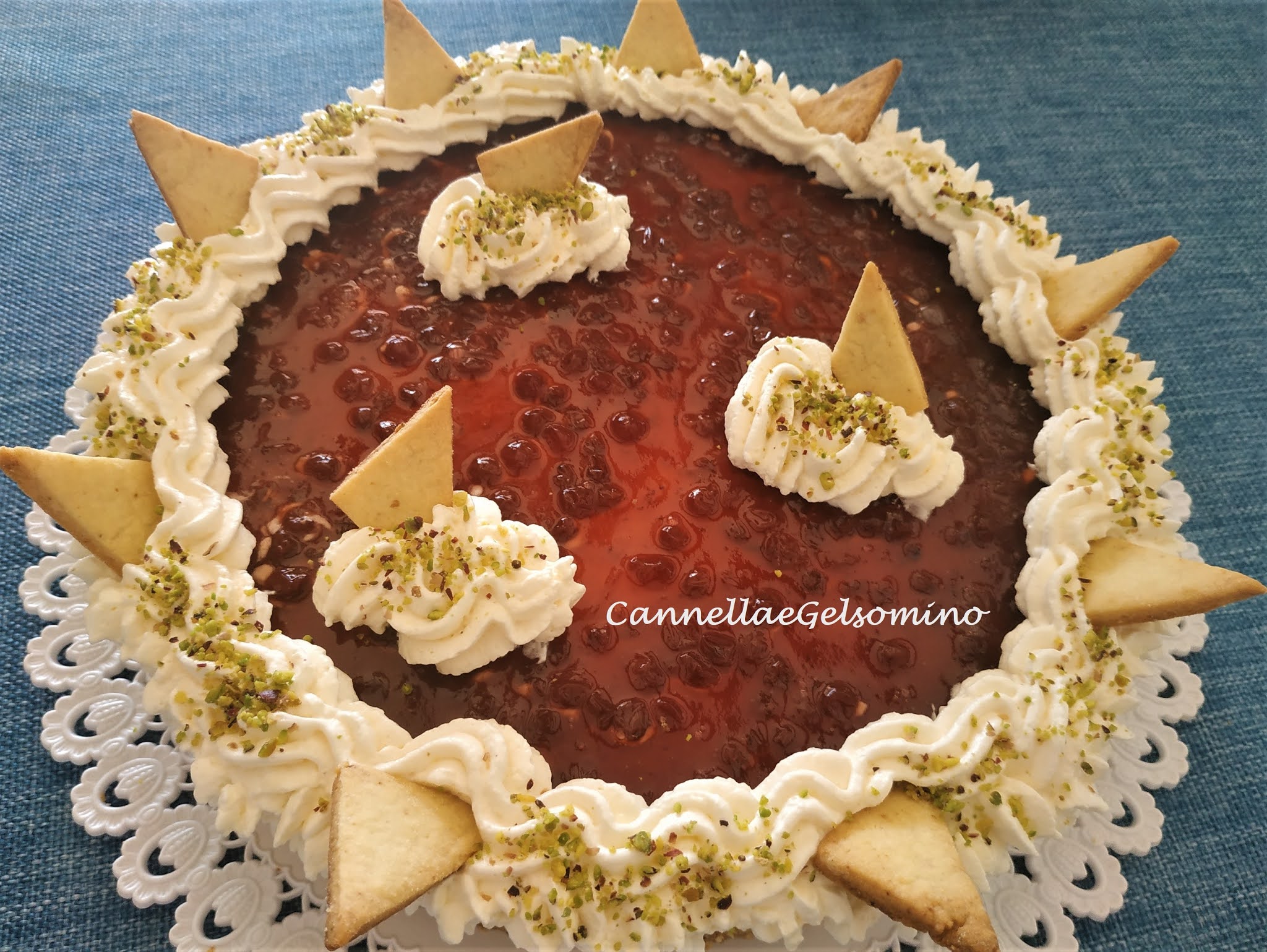 Decorate la superficie della torta con ciuffetti di crema, granella di pistacchio e biscottini di frolla.