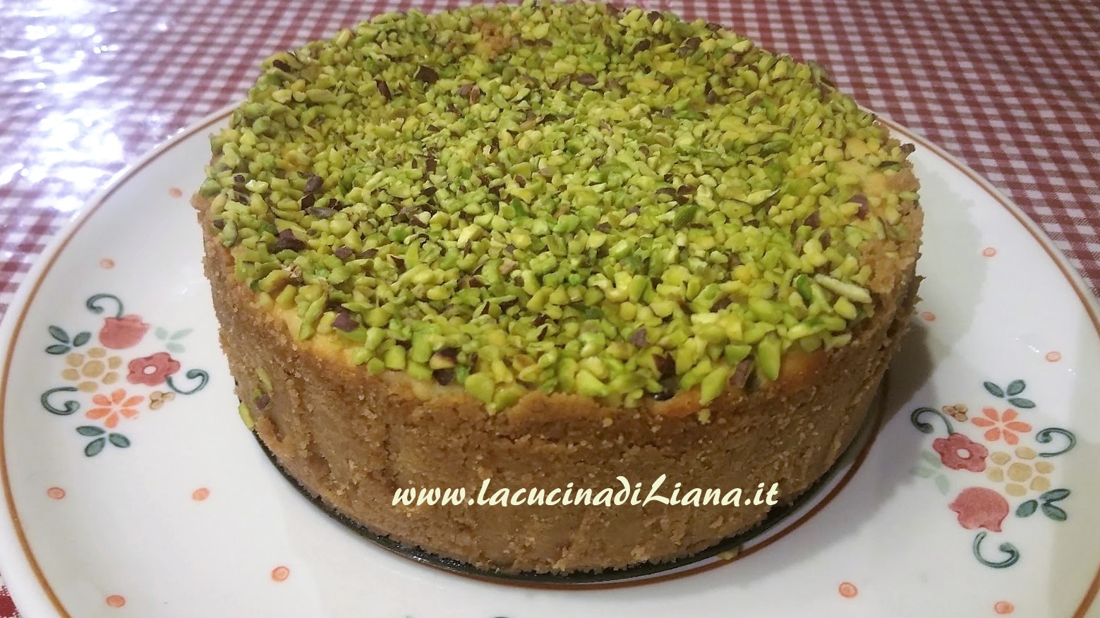 Nel frattempo, mescolare la crescenza con la ricotta, le uova, lo zucchero e il cioccolato bianco fuso fino ad ottenere una crema omogenea con cui farcire il fondo della torta preparato. Livellare bene la superficie con un cucchiaio, quindi infornare per 45′ a 150°. Cospargere la superficie della torta con la granella di pistacchi, e conservarla in frigo per almeno 5 ore prima di servirla.