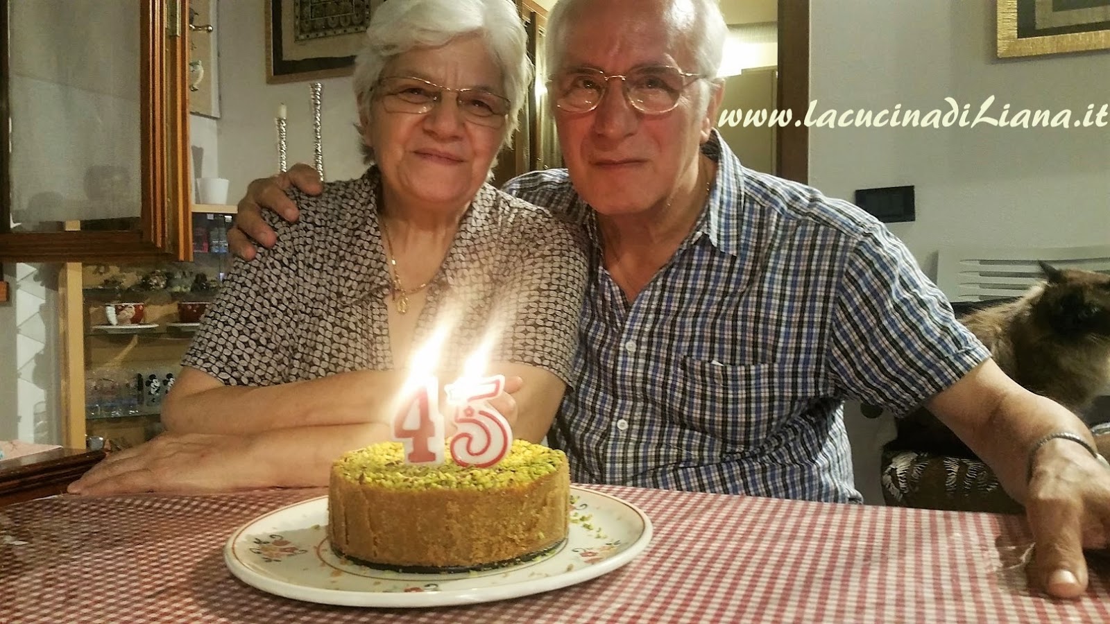 La scorsa settimana c’è stato l’anniversario di 45 anni di matrimonio dei miei suoceri, e giacchè in questi giorni, sono venuti a trovarci da Bari, ho preparato per loro una golosa Cheesecake al cioccolato bianco e cioccolato fondente con granella di pistacchio.