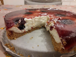 La cheesecake alle amarene è un dolce veloce, fresco e golosissimo. Non richiede cottura ed è facilissimo da realizzare. Inoltre la crema non contiene panna ma solo ricotta e yogurt greco, quindi ha un contenuto di grassi ridotto. Con le dosi indicate viene una tortina di 18 cm di diametro (sufficiente per 6 porzioni), per una tortiera da 24-26 cm occorre raddoppiare le dosi.