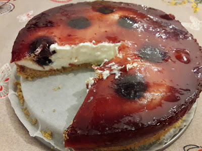 Mettere nel robot i latticini, lo zucchero a velo e la gelatina sciolta: azionare per qualche secondo finché il composto sarà ben amalgamato. Versare la crema sulla base di biscotti nella tortiera e affossarvi le amarene sgocciolate dallo sciroppo. Mettere in frigo per almeno un paio d’ore.