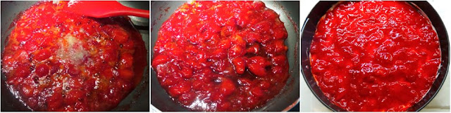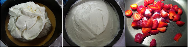 Versiamo la crema sulla base che avremo provveduto ad uscire dal frigo, livelliamola quindi mettiamo in frigo per almeno 4 ore. Trascorso il tempo di riposo, prepariamo la copertura di fragole. Mettiamo in una padella le fragole tagliate a pezzi e lo zucchero e facciamo andare a fiamma dolce.