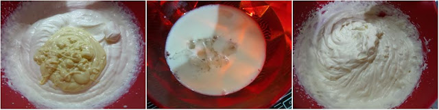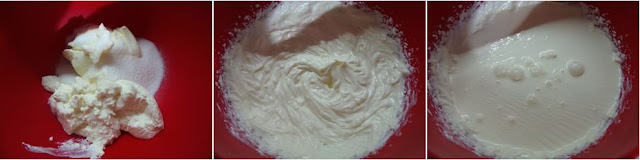 In una boule mettiamo il formaggio da spalmare, la ricotta e lo zucchero quindi, con l’aiuto di una frusta elettrica, amalgamiamo gli ingredienti. Aggiungiamo adesso la panna e continuiamo a montare con la frusta.
