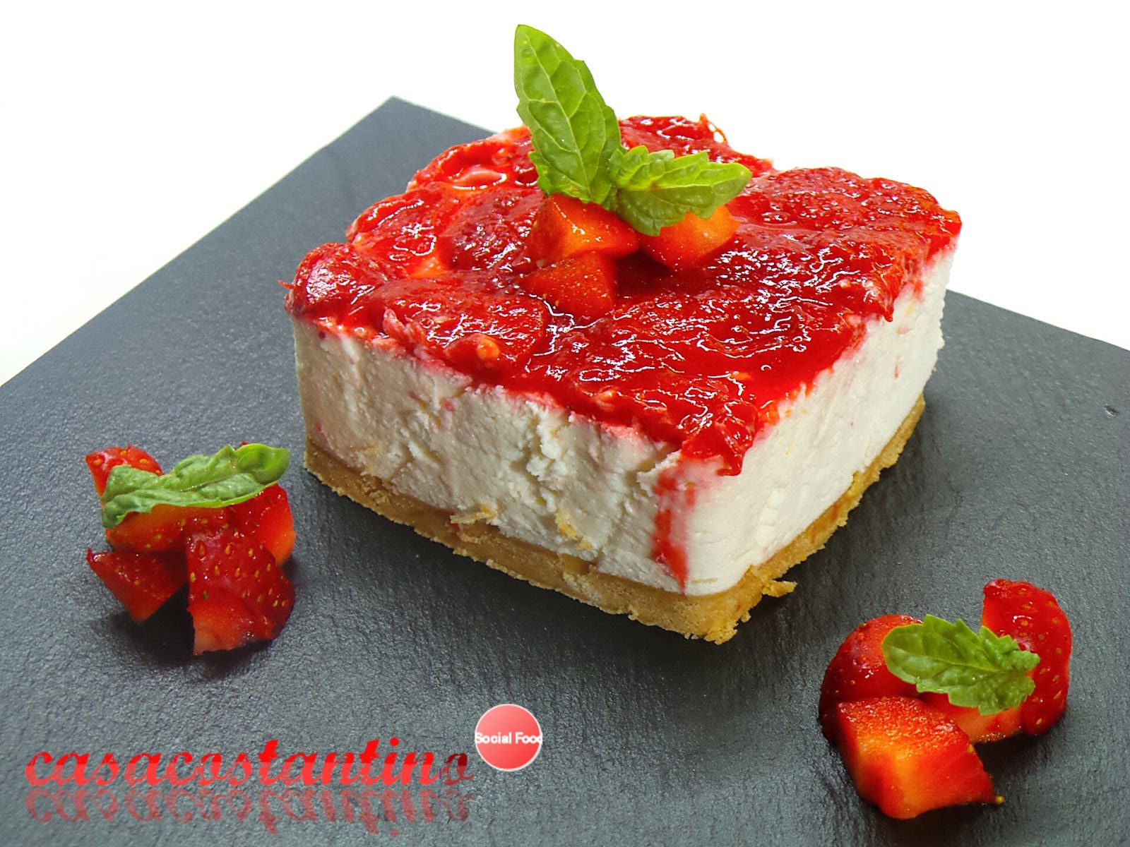 Porzioniamo la nostra torta con l’aiuto di un coppapasta quadrato per dare una forma particolare alle nostre fette di cheesecake, posizioniamo le fette sul piatto e decoriamo con qualche dadino di fragola fresca e delle foglie di basilico appena colte.