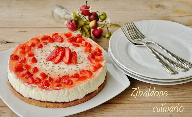 Decorare con fragole a cubetti, ricoprire con la gelatina al succo di fragola, mentre la gelatina è calda aggiungere foglie di timo (non fate il contrario, cioè prima timo e poi gelatina, altrimenti vi spostano tutte le foglie ).