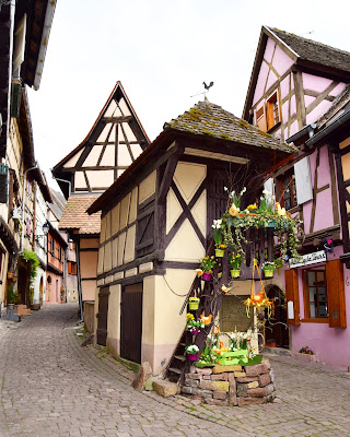 Case colorate e con i tipici intrecci in legno alsaziani sembravano aver preso vita dalla pennellata di un allegro pittore, balconi e finestre decorate con uova colorate, coniglietti di paglia, cuori di legno, paglia o rami di pino, nastri di tutti i colori…era primavera anche se il clima e il cielo erano quelli tipici del nostro autunno.