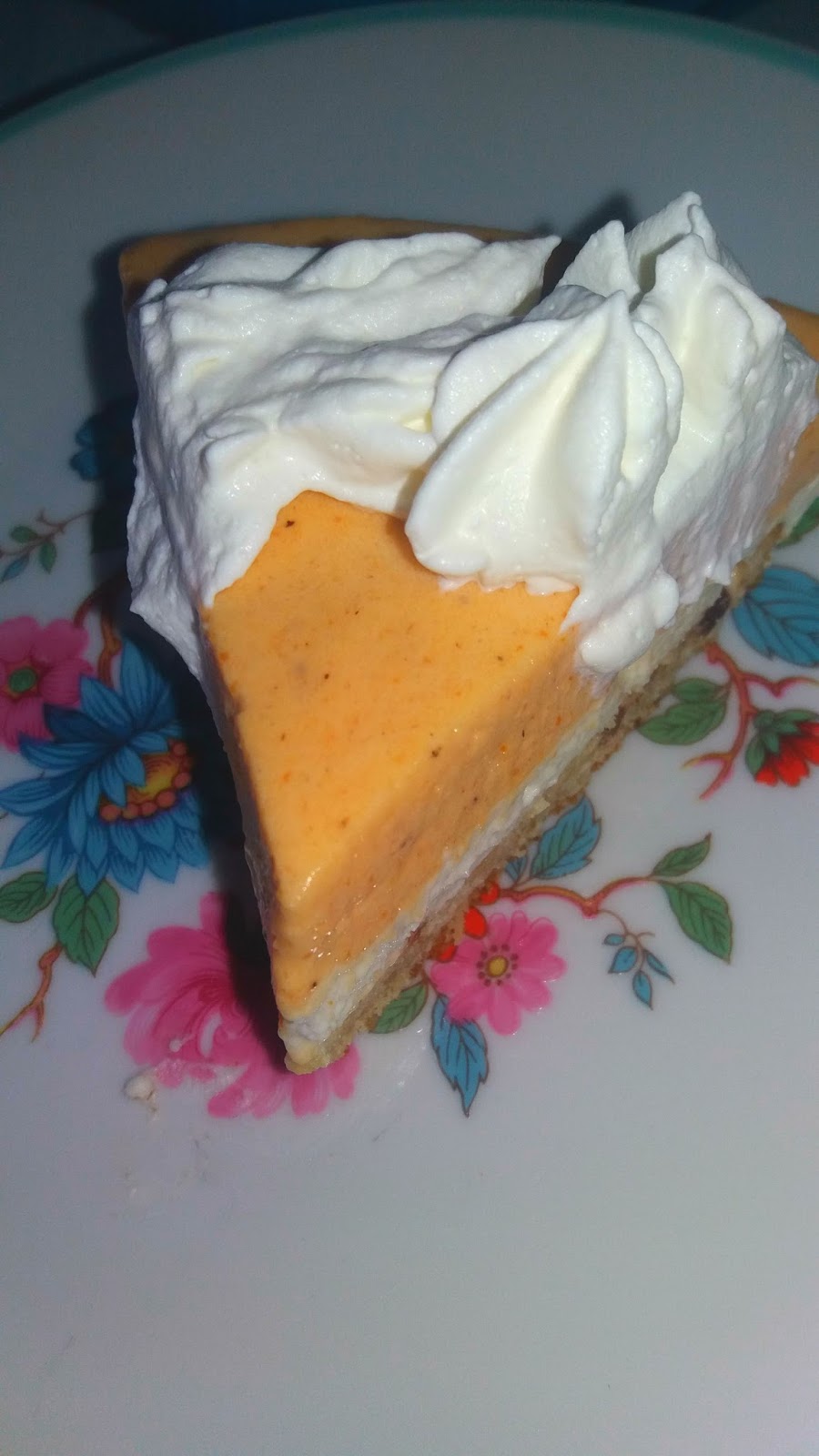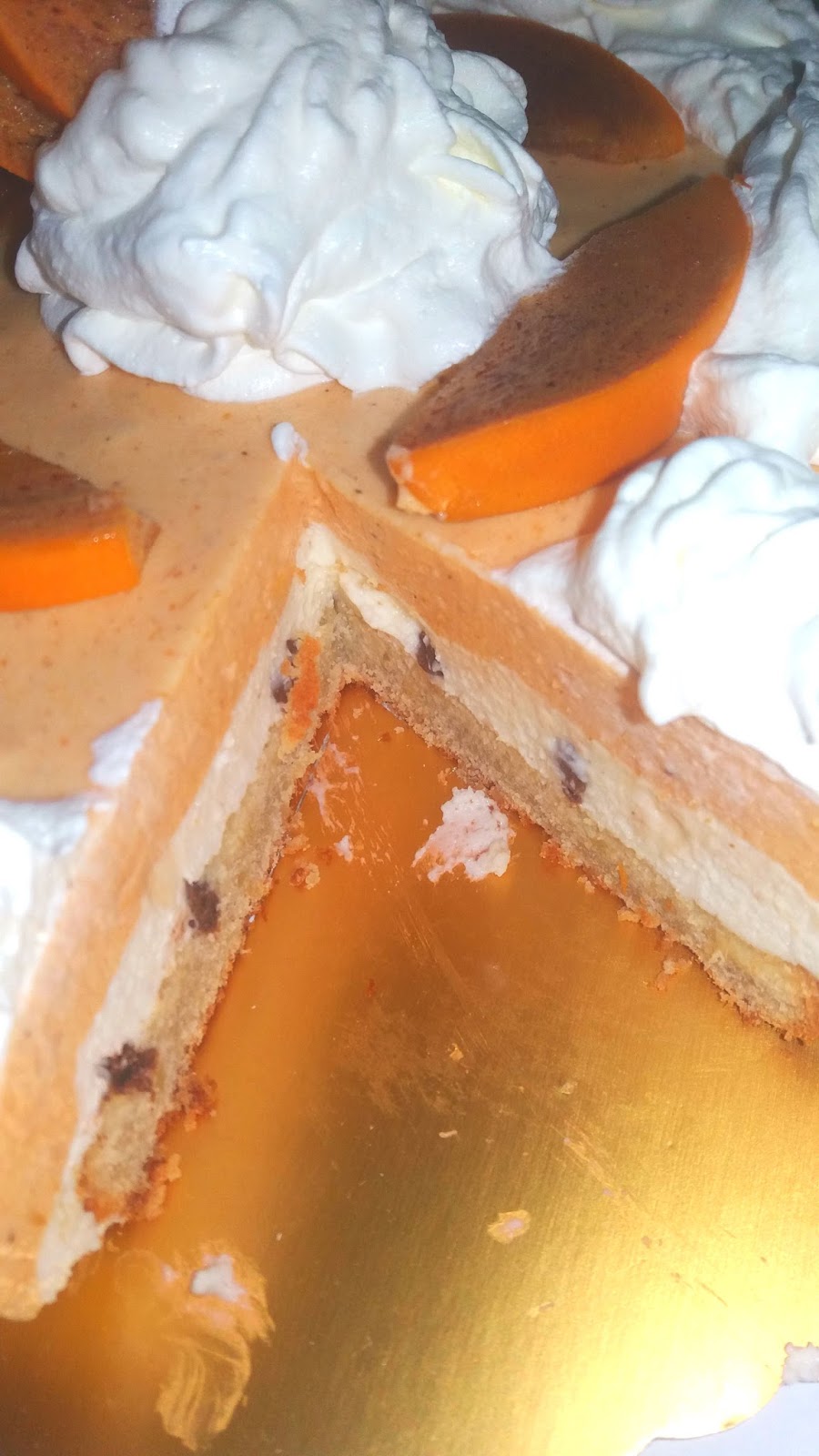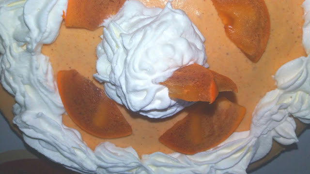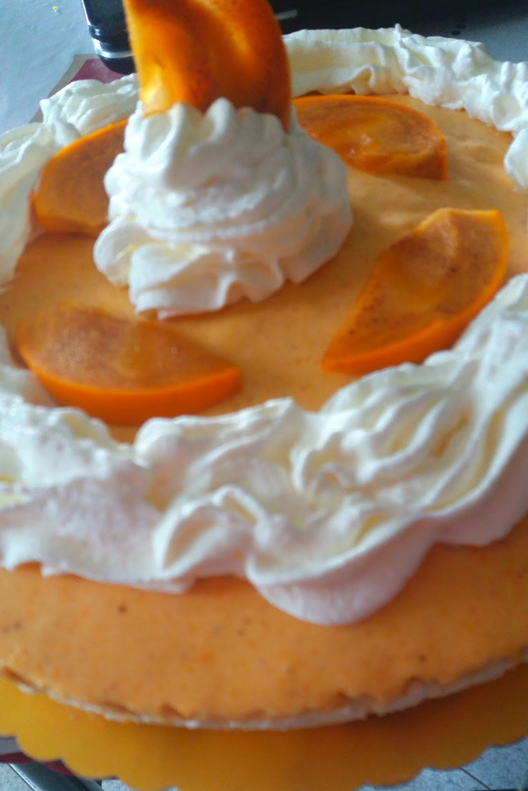riprendere la base dal frigo e versarvi la crema,pareggiare e decorare con le fette di caki e la panna