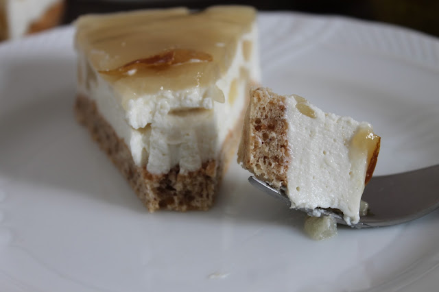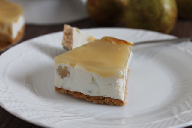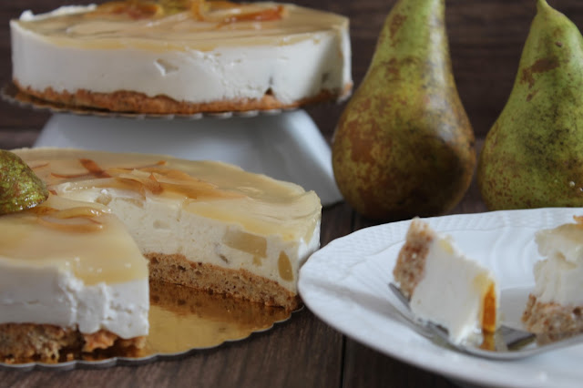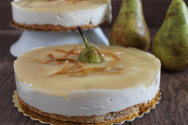 Sbucciare le pere e tagliarle a pezzi grossolani. Trasferirle in un tegamino, aggiungere lo sciroppo recuperato dalla precedente preparazione, l’acqua lo zucchero di canna e cuocere a fuoco dolce e coperto per 20 minuti. Spegnere, lasciar intiepidire 5 minuti, aggiungere la gelatina precedentemente ammollata e frullare tutto. Far raffreddare e versare sulle due basi tolte dal frigo.
