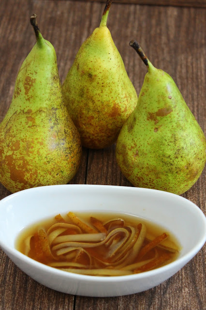 Portare a ebollizione acqua e zucchero, aggiungere le bucce di pera. Lasciar cuocere 5 minuti, spegnere e far raffreddare.
