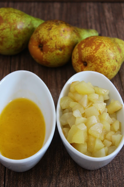 Sbucciare le pere e ridurle a dadini piccoli. Trasferirle in un tegamino, aggiungere l’acqua, lo zucchero e il burro e cuocere a fuoco dolce e coperto per 15 minuti. Spegnere trasferire in un colino, raccogliendo lo sciroppo e lasciar raffreddare.