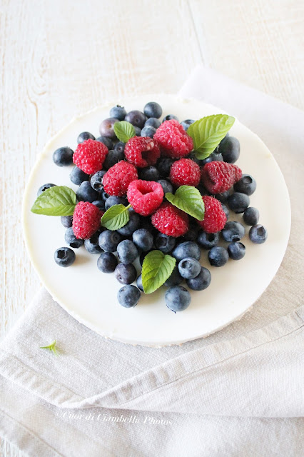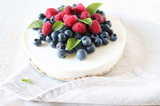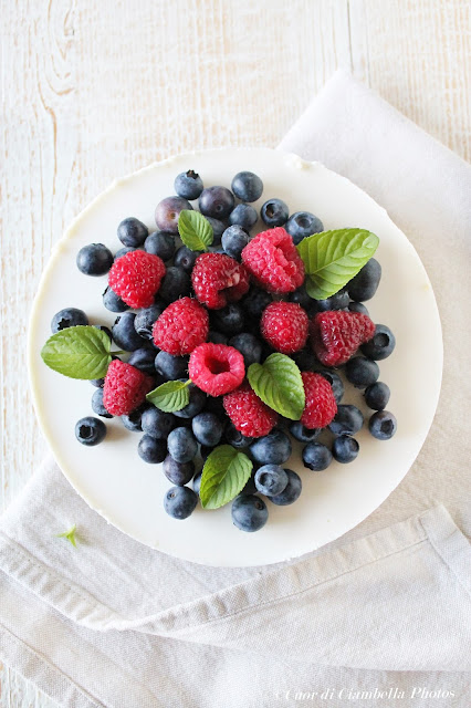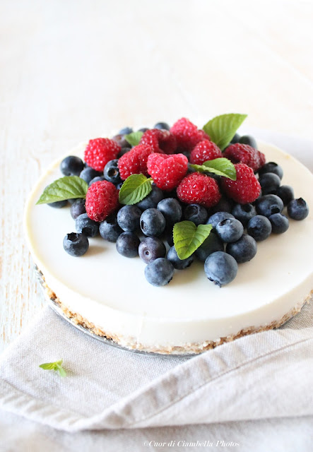Nel frattempo prepara la crema unendo i formaggi con il miele e lo zucchero a velo aiutandoti con una frusta per evitare grumi. Scalda il latte e quando è bollente scioglici la gelatina precedentemente strizzata dall’acqua in eccesso. Aggiungi il composto di gelatina alla crema e mescola bene! Versa la crema nello stampo e lascia raffreddare in frigorifero per almeno 6-12 ore. Una volta pronta decora torta con mirtilli, lamponi e foglie di menta. Si mantiene in frigorifero per 4-5 giorni se ben sigillata.