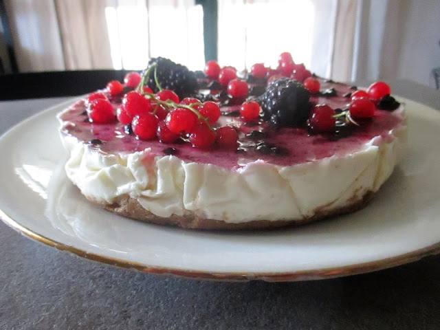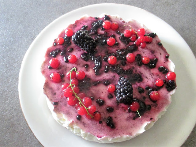 Take then, the topping of black cherry, blackberries 8, 4 raspberries, the fruit of 2 sprigs of red currants, sugar and tablespoon of water and place in a blender. Whisk well then sprinkle the surface of the cheesecake (after you spend 8 hours) .and add the remaining fruit. Let cool then well served.