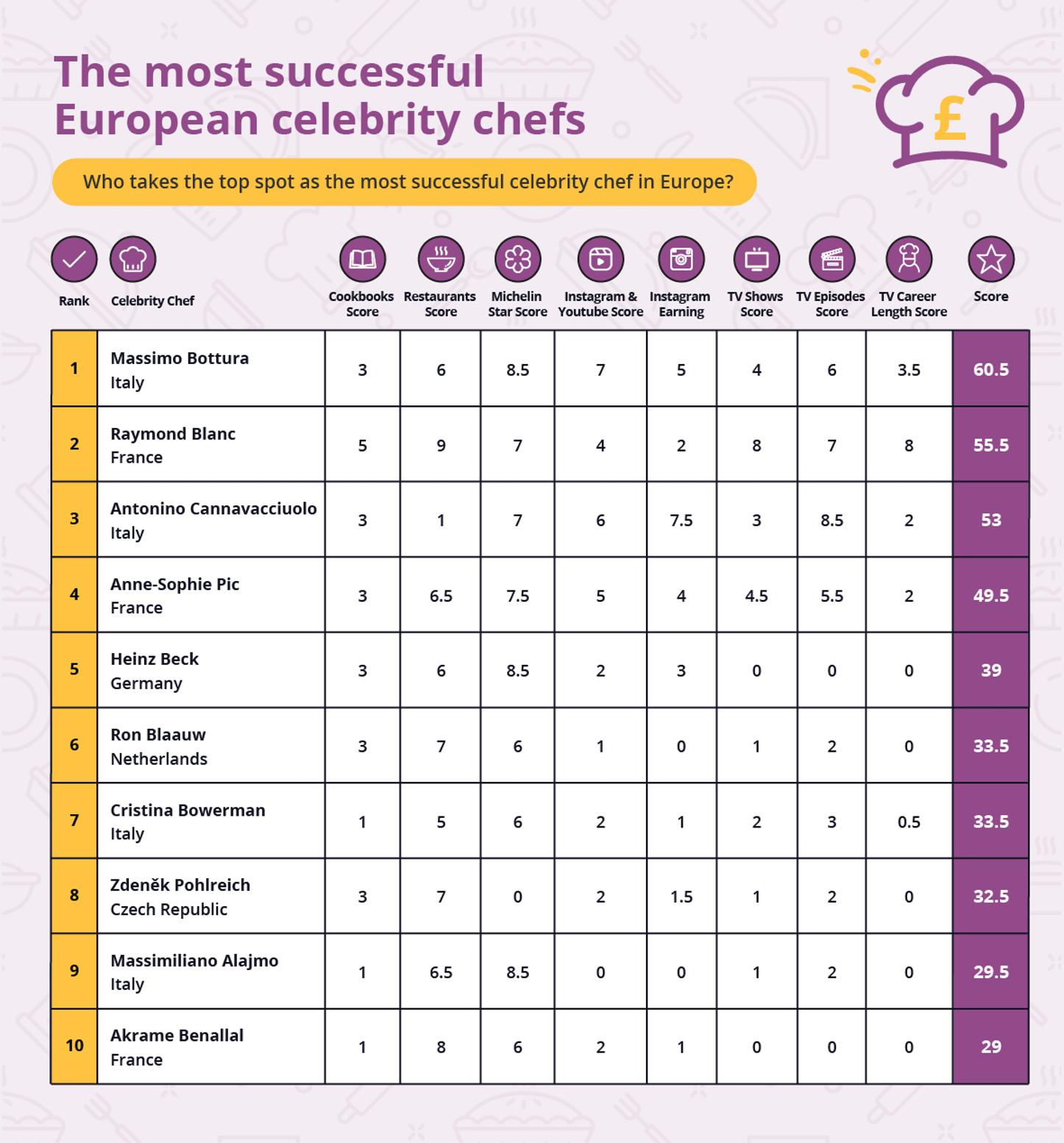 La top 10 degli chef di maggior successo in Europa (in punti):