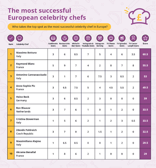 Secondo il rapporto Celebrity Chef Credit (che prende in considerazione parametri come numero di ristoranti, stelle Michelin acquisite, valore netto del business, fama televisiva, pubblicazioni editoriali e presenza sui social media), con suoi 15 libri di cucina pubblicati, 6 ristoranti e 4 stelle Michelin, un profilo social super attivo, la corona va allo chef modenese di Osteria Francescana Massimo Bottura con un punteggio di 60,5 su 120 e un patrimonio stimato in oltre 200 milioni di euro (valore economico 200.720.870 euro). Certamente uno dei tristellati del nostro Paese più famosi al mondo, più premiato e mediatico che oltretutto ha conquistato il titolo di miglior ristorante al mondo nel 2018 dopo la vittoria del 2016.