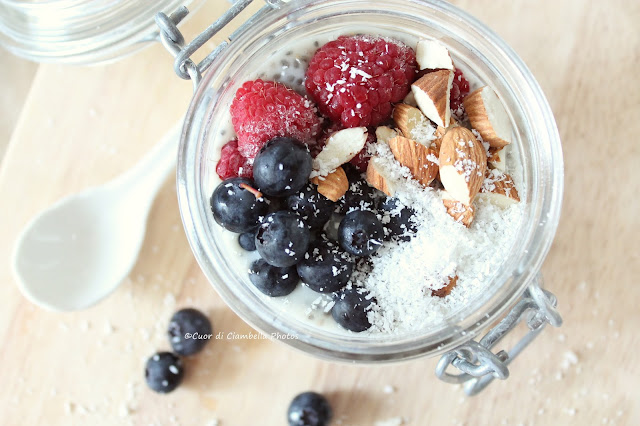 La sera prima metti in una tazza di semi di chia con il latte vegetale e lo sciroppo d’acero. Mescola bene. Chiudi con della pellicola e lascia riposare tutta la notte in frigorifero. Al mattino guarnire il chia pudding con frutti di bosco, cocco e qualche mandorla triturata. Semplice, sano e velocissimo da preparare! Un altro abbinamento super goloso se la vostra mattinata è dedicata allo sport è un chia pudding con latte di nocciole guarnito con fettine di banana e scaglie di cioccolato fondente!! Buona colazione e Buona merenda e…più Chia per tutti!