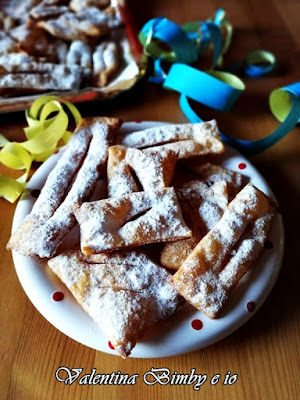 Formare una sfera con l’impasto ottenuto e farlo riposare in frigo 30 Minuti. tagliarlo in tanti pezzi e stenderli col mattarello su un piano infarinato come ho fatto io oppure con la macchinetta della pasta, formare delle sfoglie molto sottili e tagliarle a strisce o a quadrati, fare un incisione al centro e friggerle in una padella con abbondante olio di semi bollente, man mano, metterle su un foglio di carta assorbente, trasferirle in un vassoio, cospargerle con abbondante zucchero a velo e servire.
