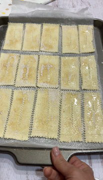 Con la rotella, pratica un’incisione al centro di ogni rettangolo senza arrivare ai bordi. Questo passaggio aiuterà le chiacchiere a cuocere in modo uniforme e a mantenere una forma elegante. Distacca leggermente ogni rettangolo dall’altro per facilitare la cottura.