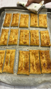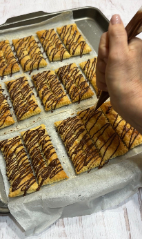 Spennella tutti i rettangoli con un po’ di latte e cospargili leggermente con zucchero a velo, in modo che la superficie diventi dorata e fragrante in forno.