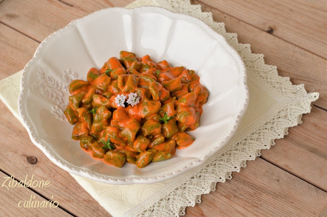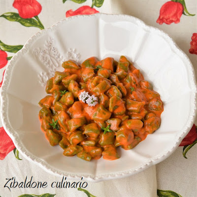 Preparare il sugo di condimento: tagliare a metà i pomodorini, scaldare in una larga padella 3 cucchiai di olio evo, unire i pomodorini e rosolare per qualche minuto. Aggiustare di sale e pepe, aggiungere il concentrato e 100ml di acqua. cuocere per 10 minuti circa. Mettere nel bicchiere del minipimer e frullare. Rimettere in padella unire la panna, aromatizzare con santoreggia e scaldare.