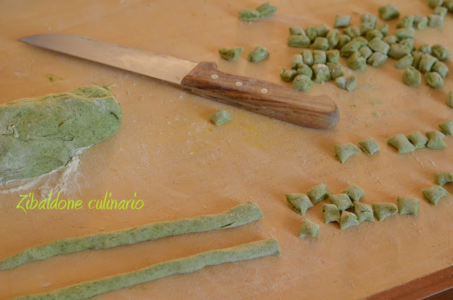 Con l’aiuto di farina formare delle strisce di impasto dal diametro di 1,5 cm e poi tagliare le chicche (lunghezza circa 1-2 cm) .