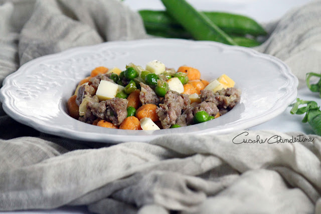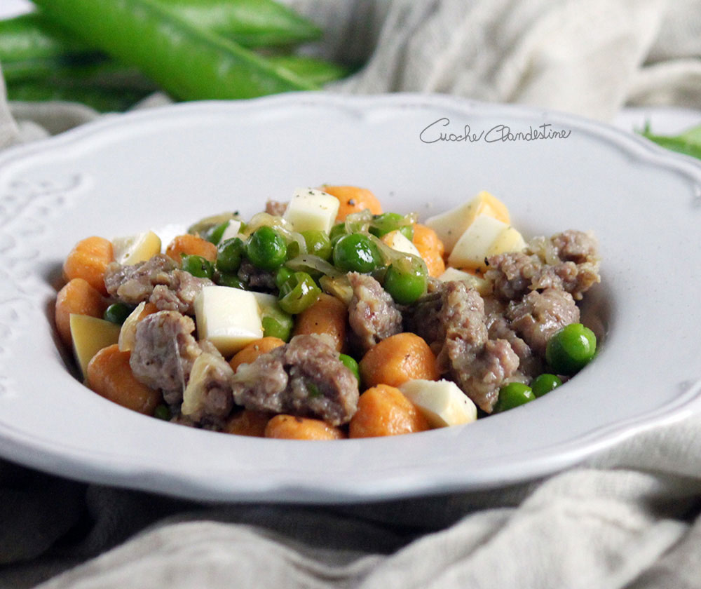 Affettate la cipolla e si fa rosolare a fuoco vivo in una padella con 6 cucchiai di olio di oliva. Si aggiungono poi i piselli e la salsiccia sminuzzata e si fa cuocere, aggiungendo qualche cucchiaio di acqua se il ragù risulta troppo asciutto. Fare cuocere per circa 15 minuti o comunque fin quando i piselli saranno cotti. Noi non abbiamo salato il sugo perché la salsiccia ha dato sufficiente sapidità.