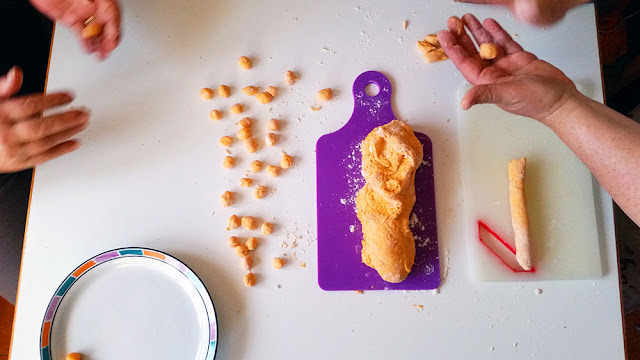 In una insalatiera abbiamo poi messo la batata schiacciata, la farina, un pizzico di sale e abbiamo impastato. La pasta va fatta riposare 10 minuti in frigorifero.