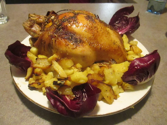 Préparer les pommes de terre. Laissez-les bouillir dans une cocotte-minute, puis les peler et pelez en morceaux pas très grandes. les transférer sur une plaque de cuisson et le mettre sur le beurre de romarin, sel et pepe.Tenete côté et cuire au four lorsque vous faites cuire le poulet.