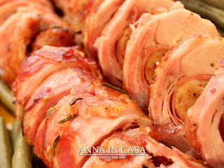 Over each couple of slices put in the middle some stuffed. Roll the meat and close it well. Roll in the bacon and then wrap and rest in the frige for about half an hour.