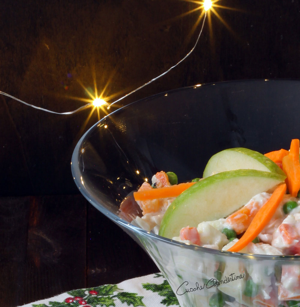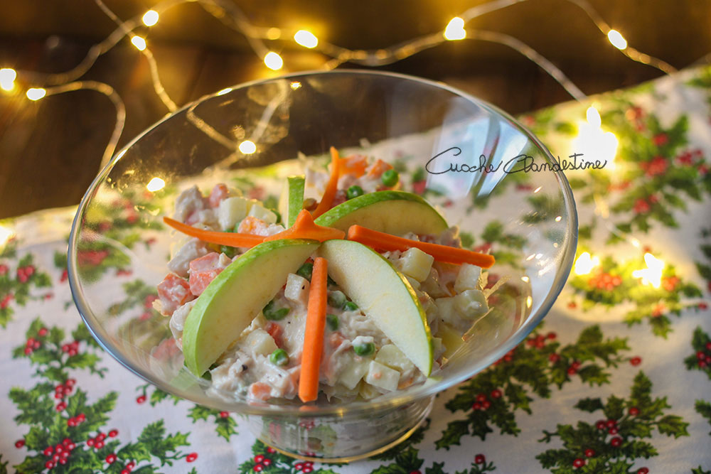 Hemos elegido replicar la Ensalada de pollo porque está muy cerca de lo que es nuestra Ensalada Rusa, que es un plato típico para las fiestas. Por otro lado, es difícil encontrar los ingredientes para los otros platos, por lo que decidimos ofrecer algo tradicional con un toque exótico. ¿Te gustaría probar?