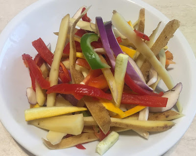 Stavolta io ho utilizzato ciò che avevo in casa: patate, melanzane e zucchine gialle e per dare più colore anche un peperone rosso.