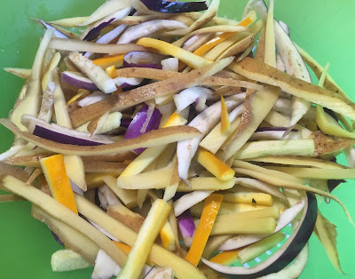 Lavate bene sotto l’acqua corrente gli ortaggi, quindi sbucciateli con un pelapatate. Metteteli nuovamente sotto l’acqua corrente, scolateli e asciugateli con carta assorbente da cucina. Intanto pulite il peperone dai semi e dai filamenti e tagliatelo a listarelle. Allo stesso modo fate con le bucce delle patate, melanzane e zucchine.