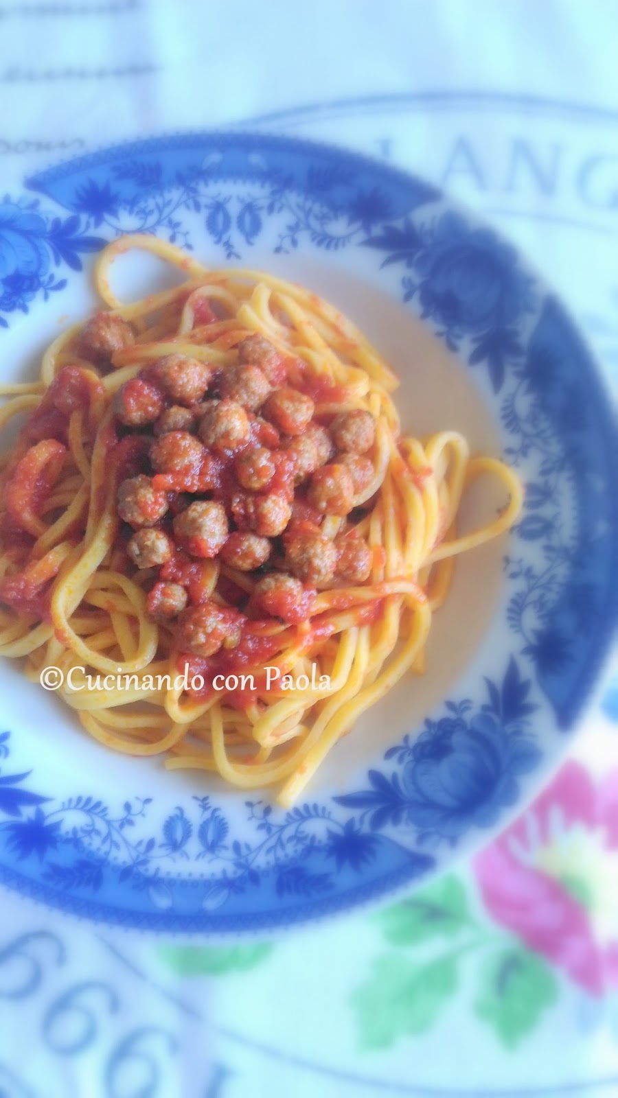 Mescoliamo la carne macinata con il parmigiano, aggiustiamo di sale e noce moscata. Ora formiamo le pallottine molto piccole, aiutandoci con le mani leggermente unte d’olio; sbollentiamo le pallottine e versiamoli nel sugo e lasciamo insaporire per 5 minuti. Cuociamo la pasta in abbondante acqua salata, per il tempo indicato sulla confezione (6-7 minuti) scoliamola e amalgamiamola nel sugo di pomodoro, alla fine completiamo con le pallottine. Servite e buon appetito!