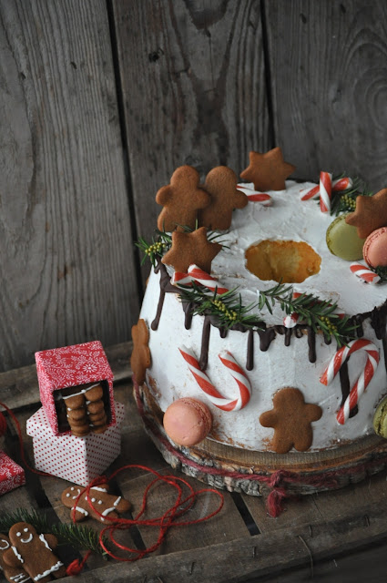 Una Chiffon all’arancia e cioccolato in versione natalizia, decorata con biscotti speziati e macaron…