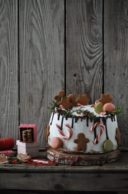 Una Chiffon all’arancia e cioccolato in versione natalizia, decorata con biscotti speziati e macaron…